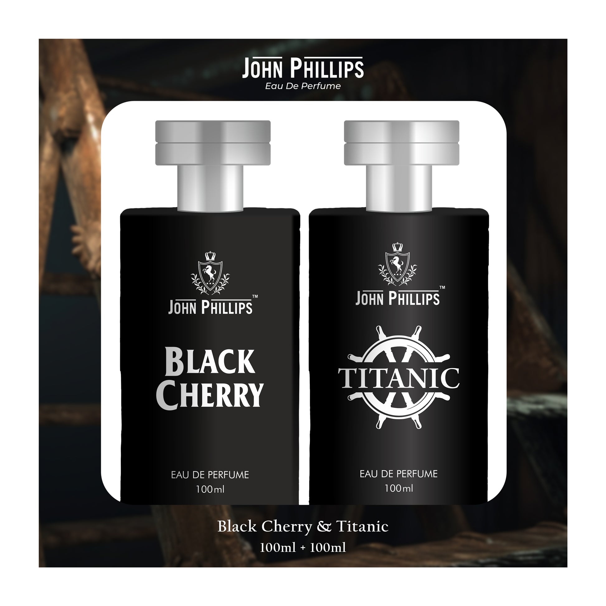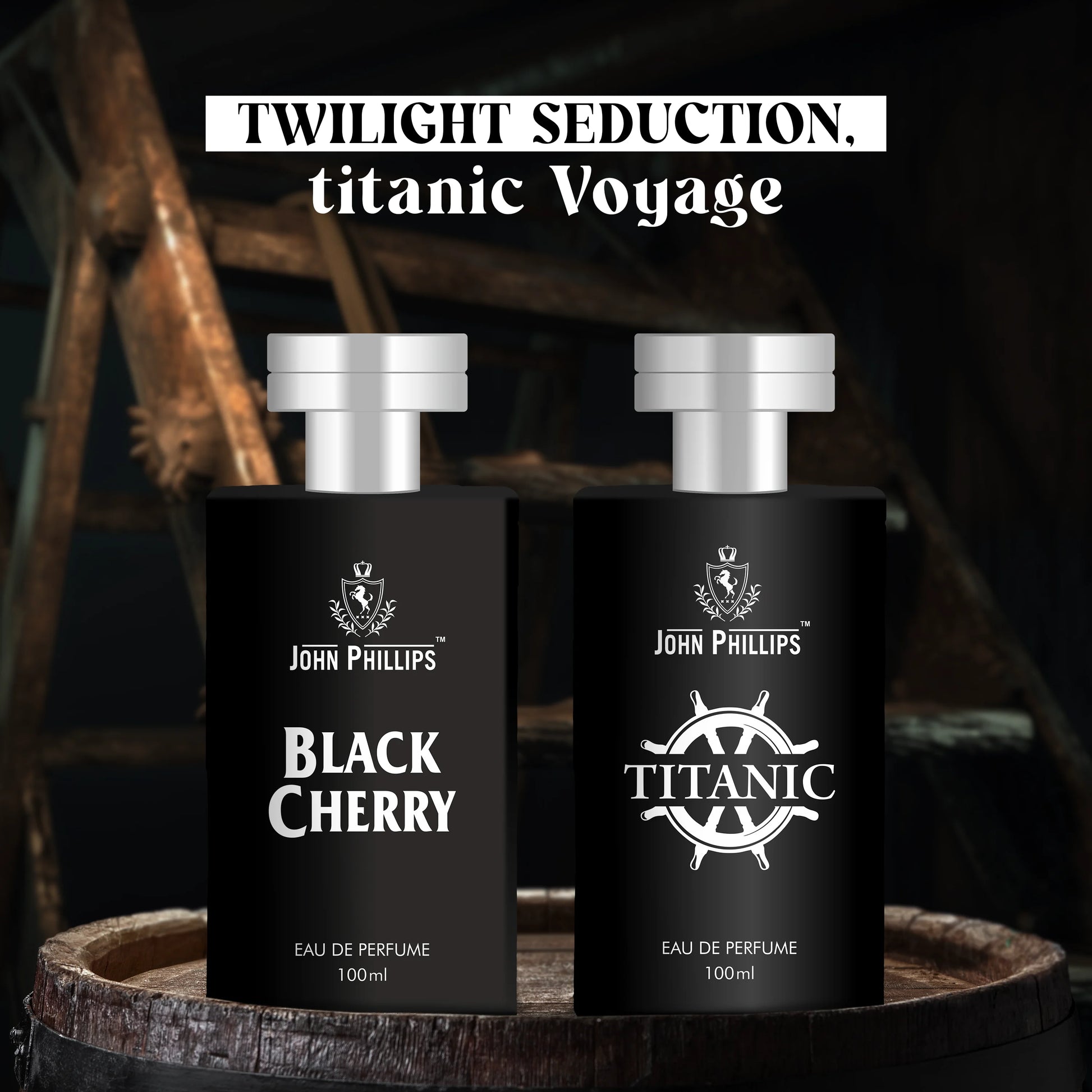 Introducing John Phillips Perfume Collection: BLACK CHERRY Eau De Perfume combines darkness and elegance with floral, citrus, and spice notes. TITANIC Eau De Perfume embodies tenderness and mischief with fresh citrus and clove, ending in woody-musk and tobacco undertones. A collection of elegance, power, and magnetism for an irresistible fragrant journey.