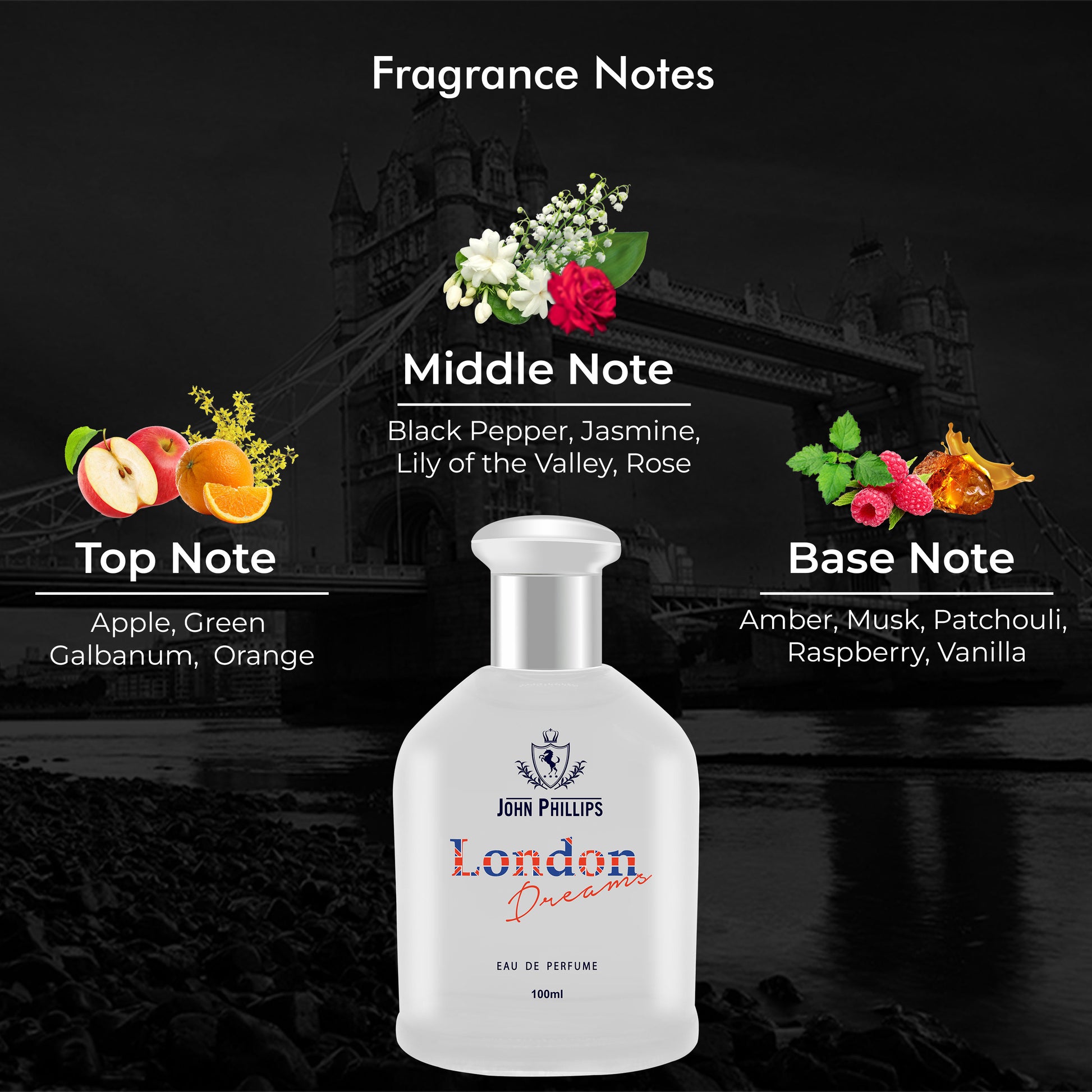 LONDON DREAMS is a simple and clear fragrance. It opens with orange, apple and refreshing green galbanum accords. The heart note encompasses jasmine, rose, lily and a spiced black pepper while the base introduces amber, musk, patchouli, vanilla and raspberry.